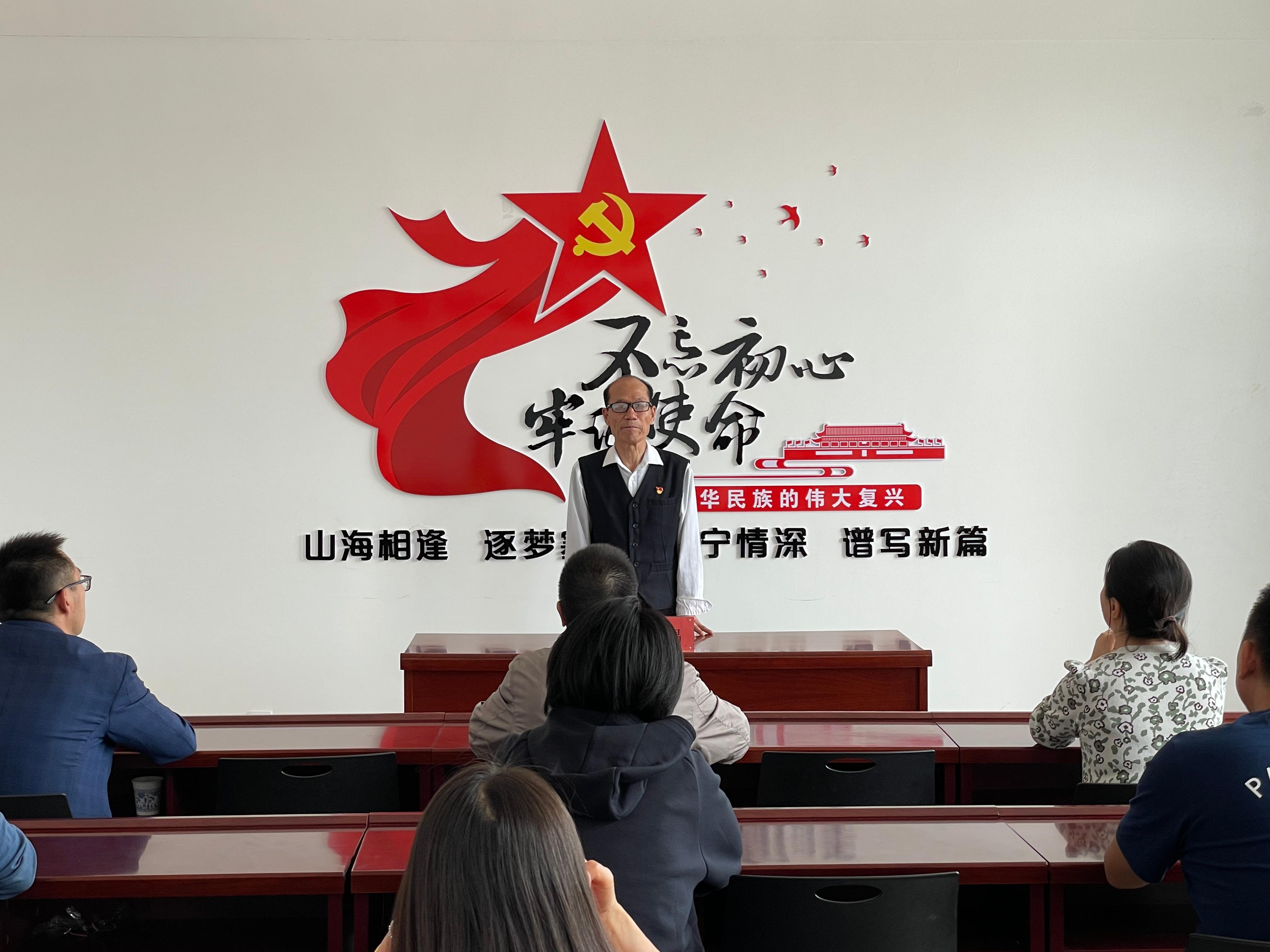 在山海小院,热播剧《山海情》中“马得福”原型人物--原闽宁镇福宁村村支书谢兴昌同志为我支部党员上了一堂主题党课,生动讲述了闽宁村脱贫致富,从昔日的干沙滩变成了繁荣富裕的金沙滩的发展历程。