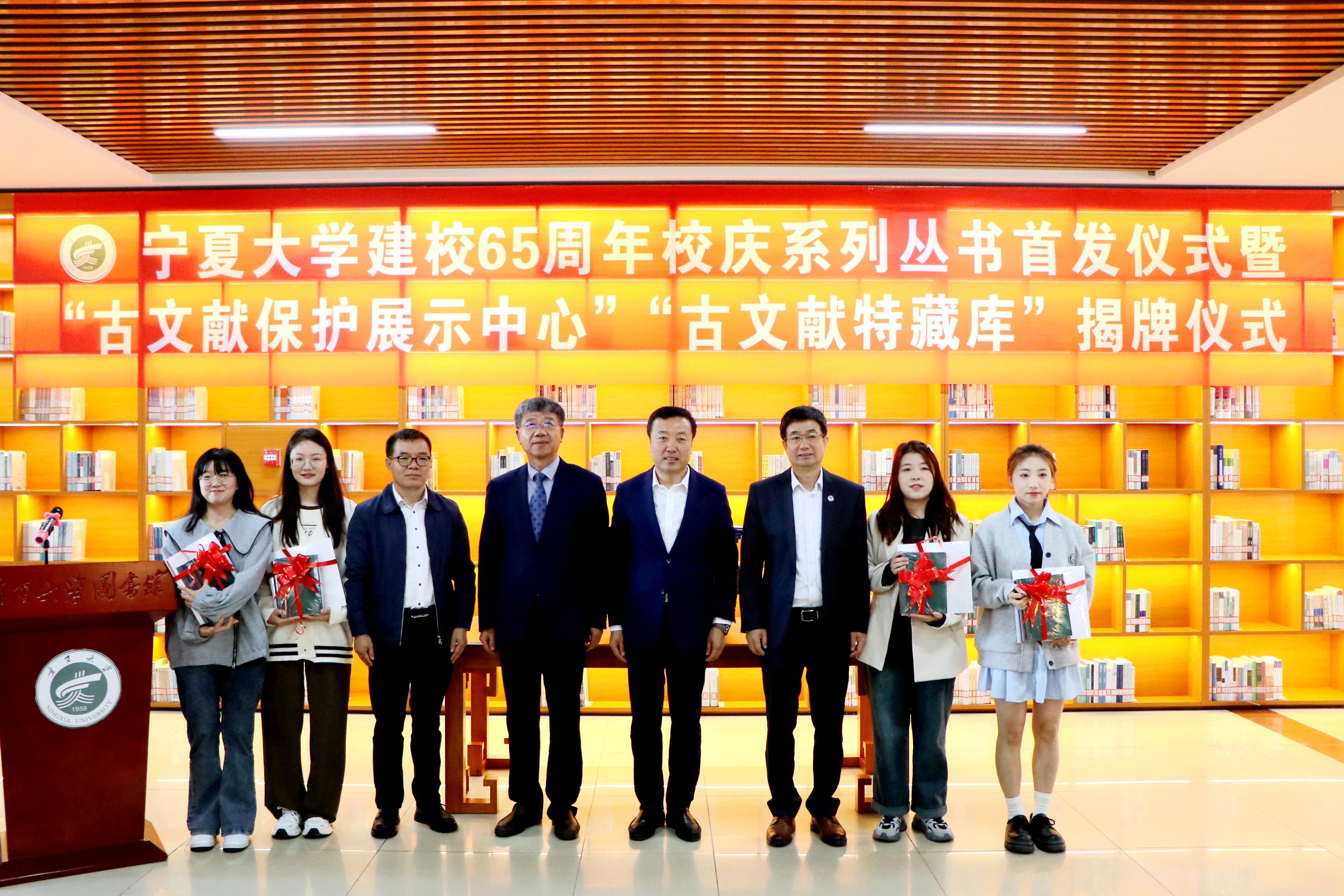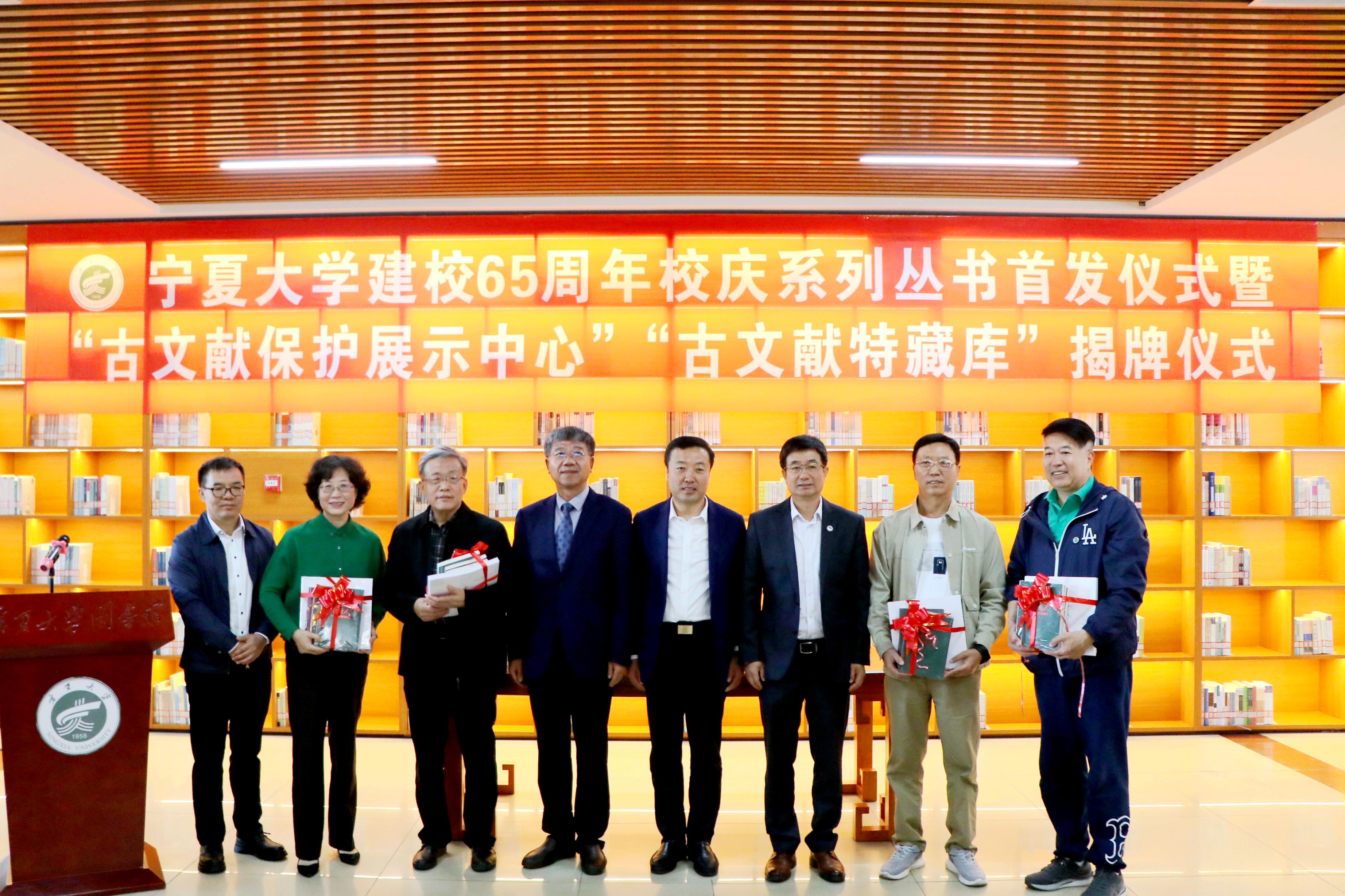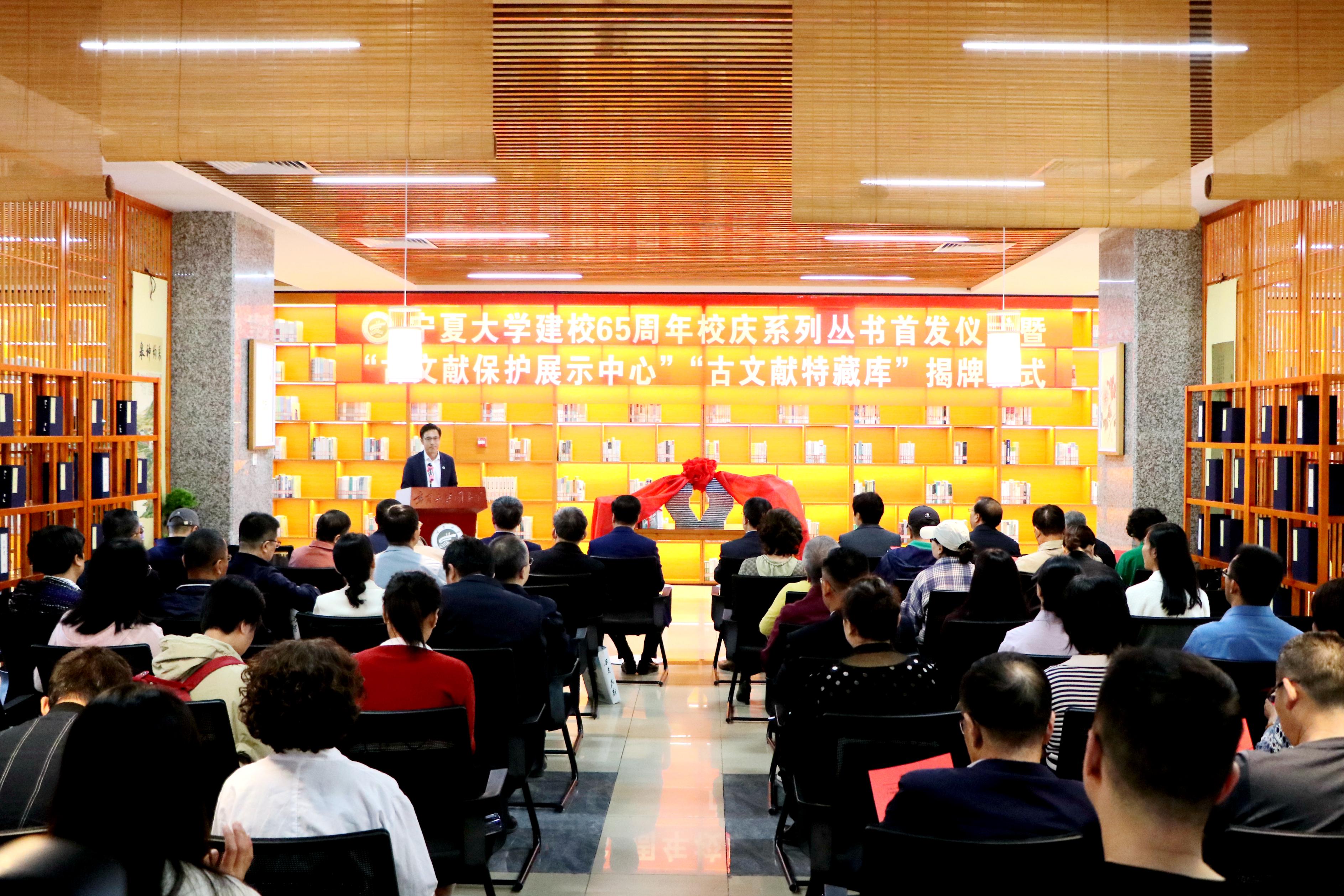 【宁夏大学新闻中心讯 张景 图书馆/文 张景/图】9月26日,宁夏大学建校65周年校庆系列丛书首发仪式暨“古文献保护展示中心”“古文献特藏库”揭牌仪式在怀远校区逸夫图书馆举行。自治区党委宣传部副部长马英俊,校党委副书记周震,原副校长、自治区政府参事、文联副主席郎伟,自治区党委宣传部出版处处长李莉,党委常委、统战部部长何风隽,党委常委、宣传部部长高永兴出席仪式。仪式由高永兴主持。
