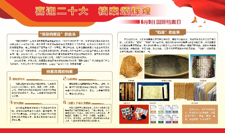 这次宣传活动主要通过制作宣传展板、电子屏幕图片,以及利用微信公众号推送宣传文章等方式,给学校师生科普了“国际档案日”的由来、档案及高校档案、“档案”一词的由来,以及学校档案工作的概况等内容。