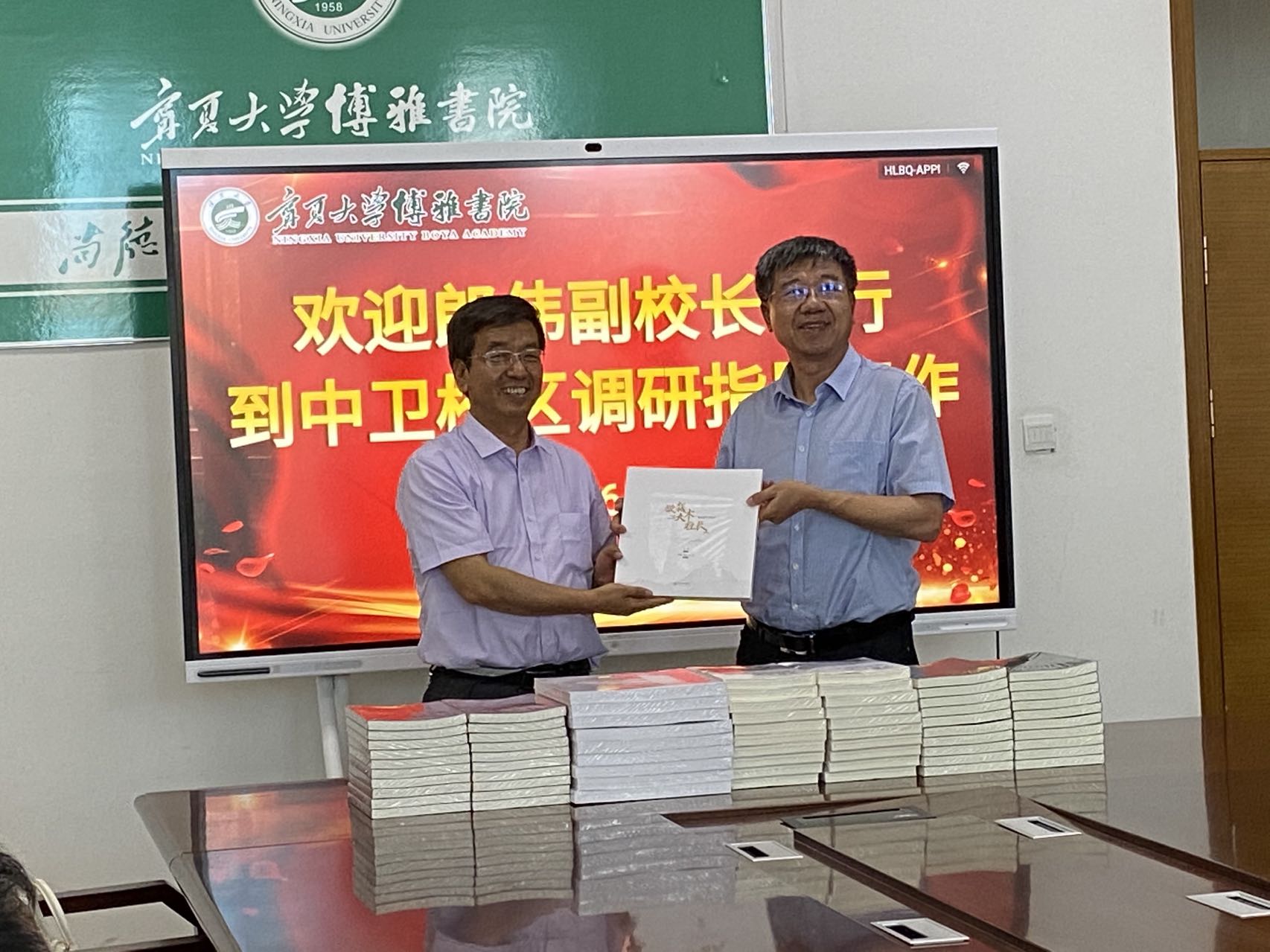 会上,郎伟向中卫校区“四院一部”及图书馆(中卫分馆)捐赠了《贺兰山下种树人(一、二辑)》《欲载大木柱长天》《宁夏大学2008-2018》等书籍;听取了中卫校区“四院一部”在档案收集、管理及校史研究等方面工作存在的问题和建议。