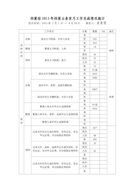 档案馆2013年业务档案室月工作完成情况统计