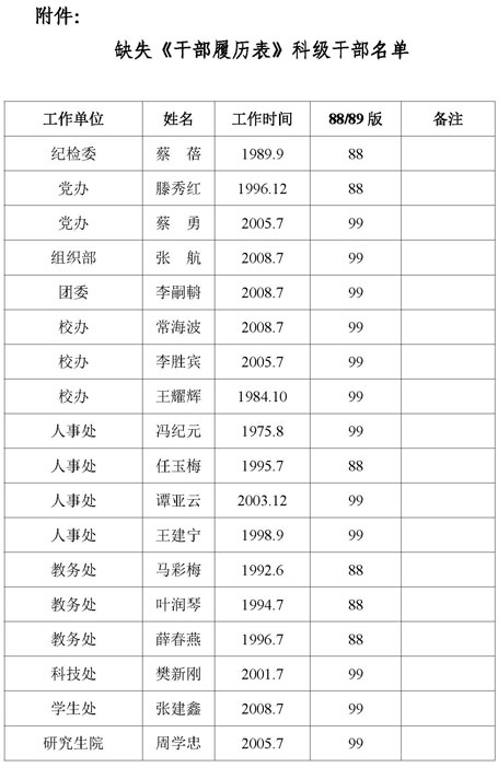 自2012年开始,校党委组织部、档案馆对全校科级档案进行了认真整理,发现部分科级干部档案缺失《干部履历表》。根据自治区党委组织部有关干部档案整理的要求,现将缺失《干部履历表》的科级干部名单公布如下(见附件)。