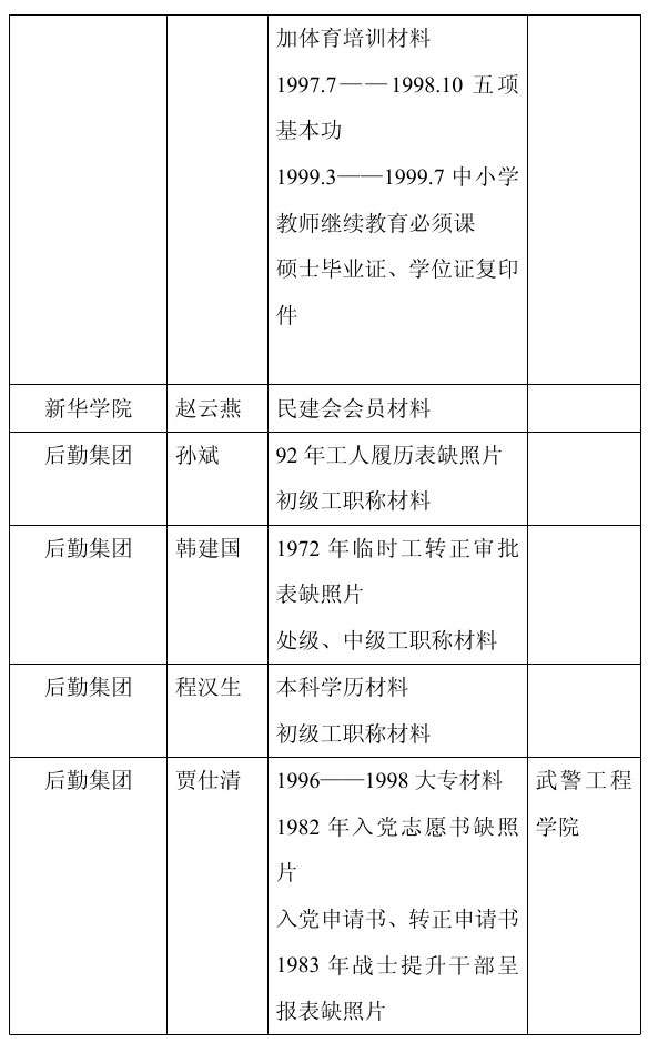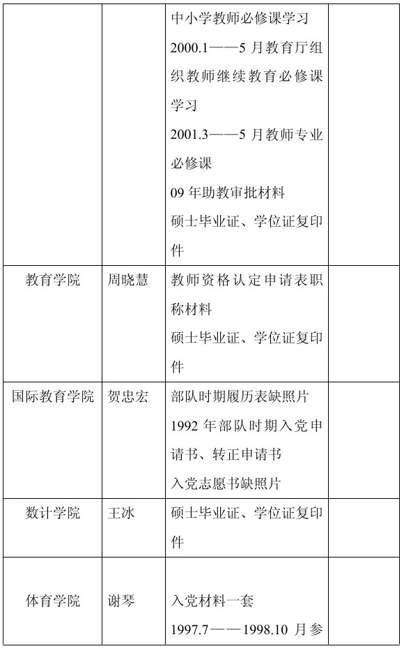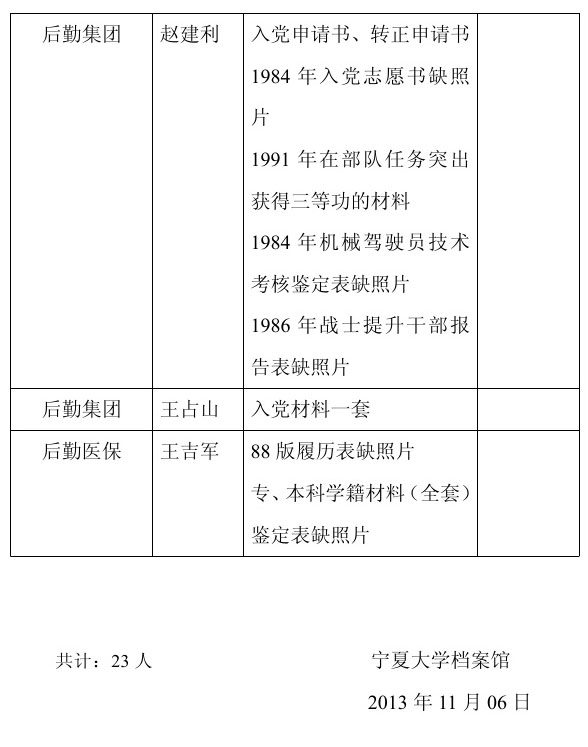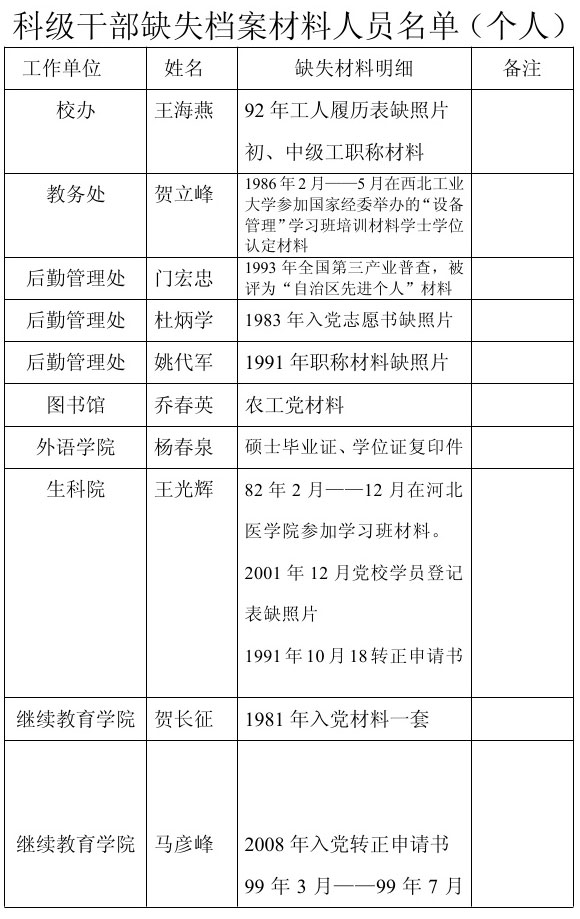 档案馆于2013年3月18日已将科级干部档案中个人缺失材料公布于校园网上,大部分老师已按规定时间补交了材料,截止2013年11月14日还有部分同志的缺失材料尚未交过来。根据区党委组织部关于干部人事档案整理的规定,为了确保个人档案信息资料完整、准确,希望相关部门领导督促本单位缺失材料人员及时补齐个人档案材料,于2013年12月10日之前将材料交到档案馆人事档案室(A区主楼212室),感谢您对我们工作的大力支持与积极配合!